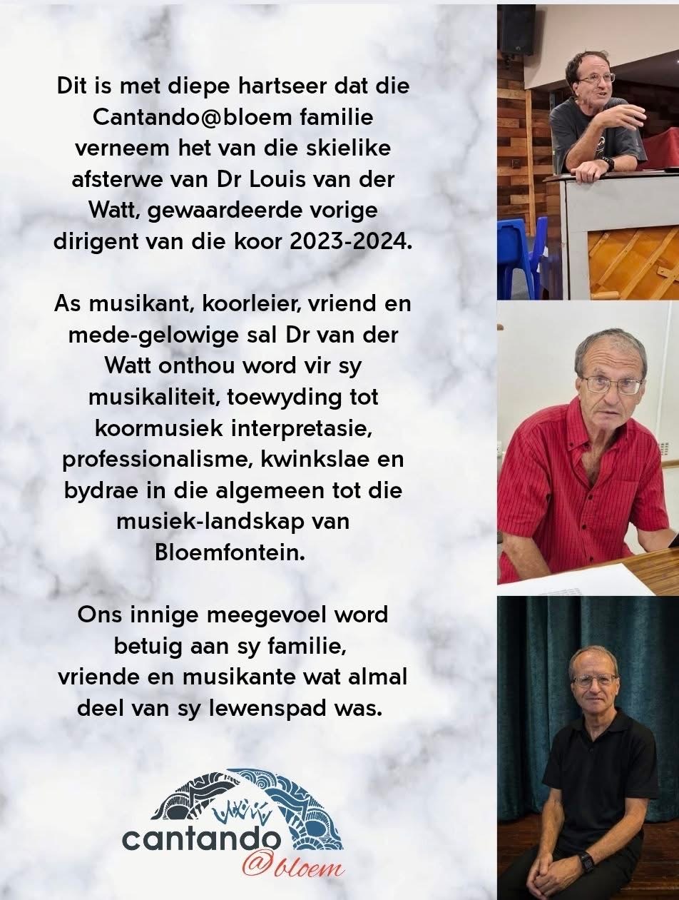 Dit is met diepe hartsser dat die cantando@bloem -familie verneem het van die afsterwe van Dr Louis vd Watt.